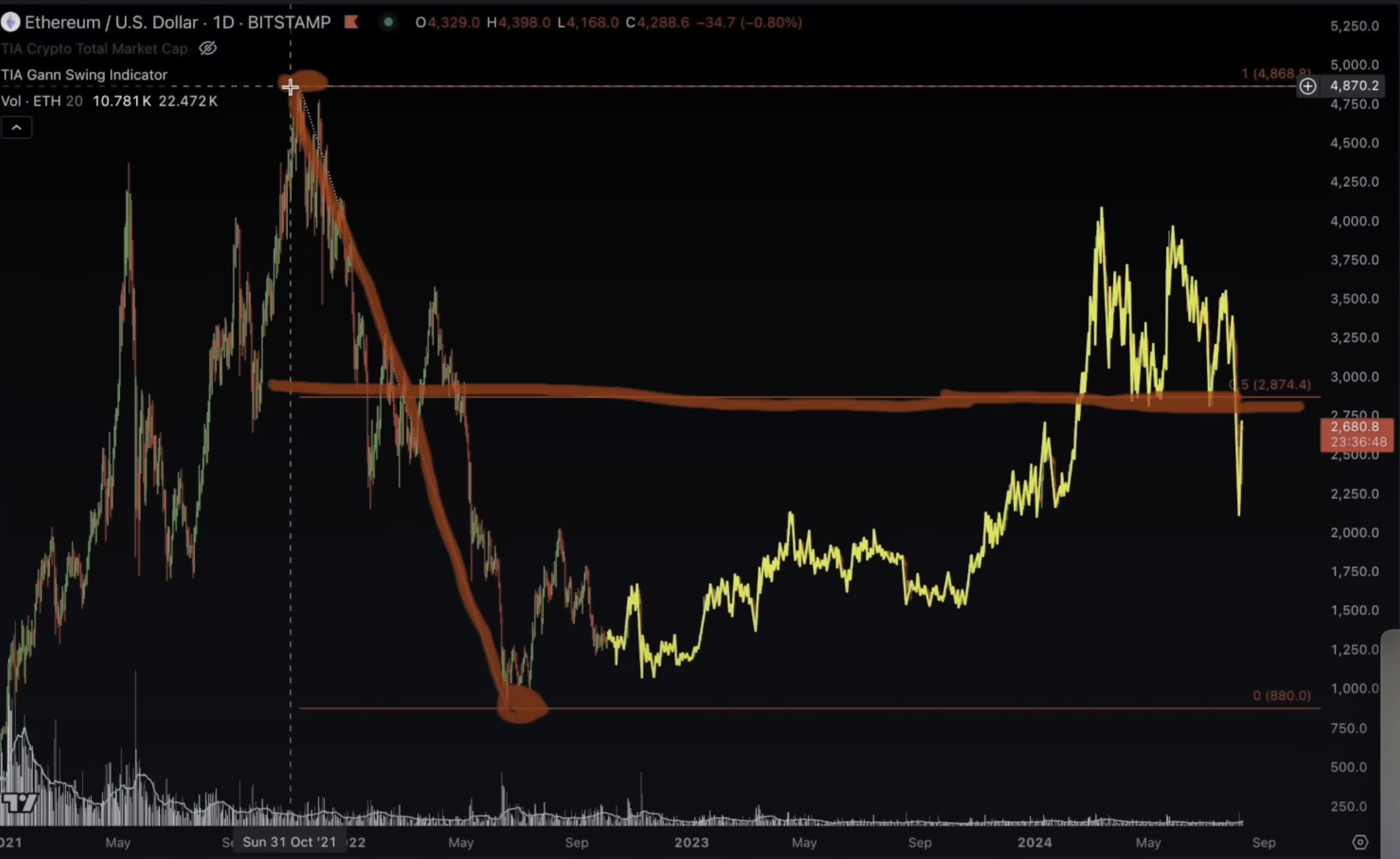 Next up, the analyst says that Ethereum (ETH) could remain in a bullish trend if it convincingly reclaims support at $2,900, the 50% level of the bear market range.