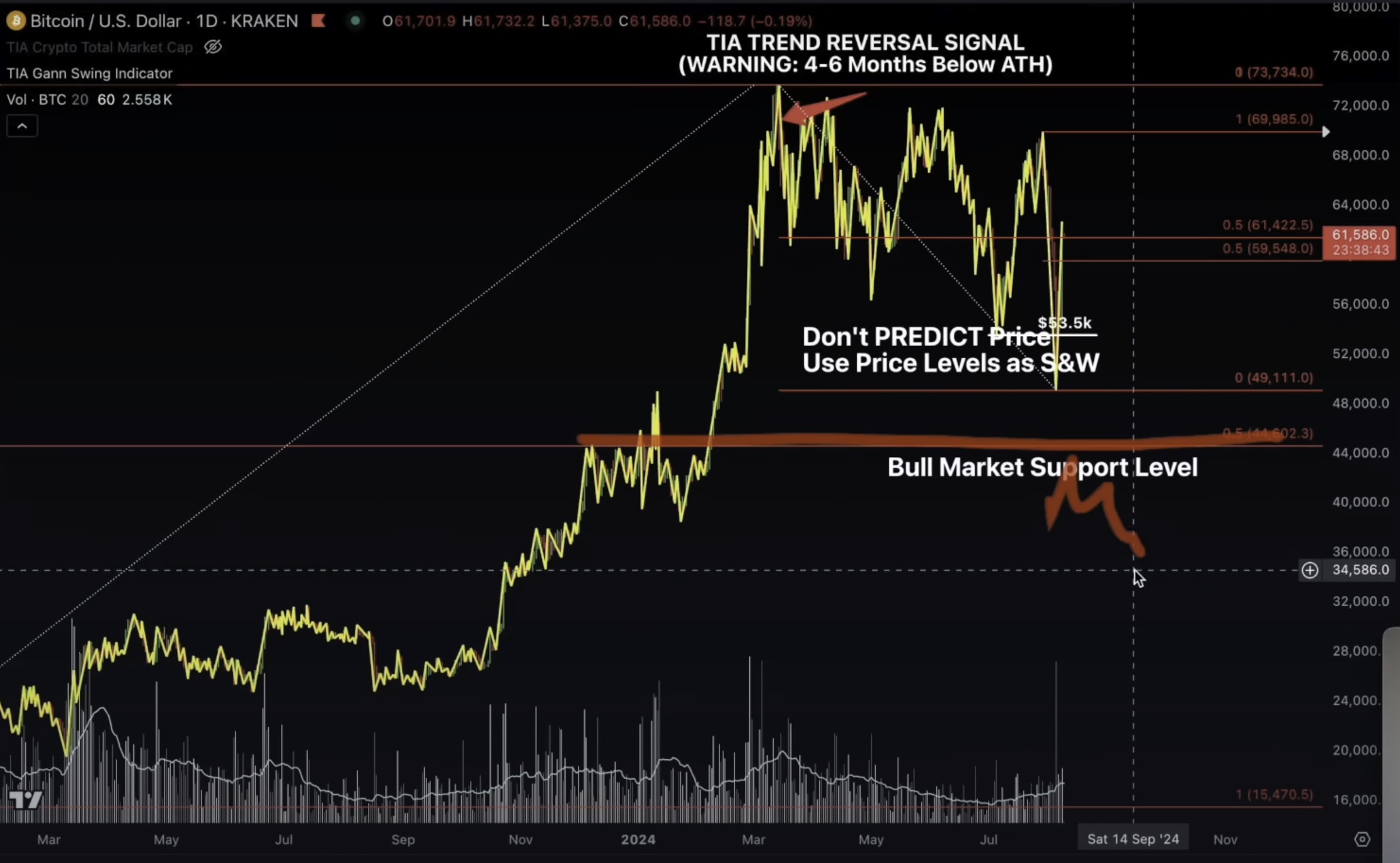“Strength is price action above $44,600, which is the bull market support level. Anything under that level that closes on a weekly or monthly basis is going to be pretty severe consequences for the Bitcoin market. That is my flipping point, that flipping point for the bull and the bear market. Underneath that level, not great signs.”