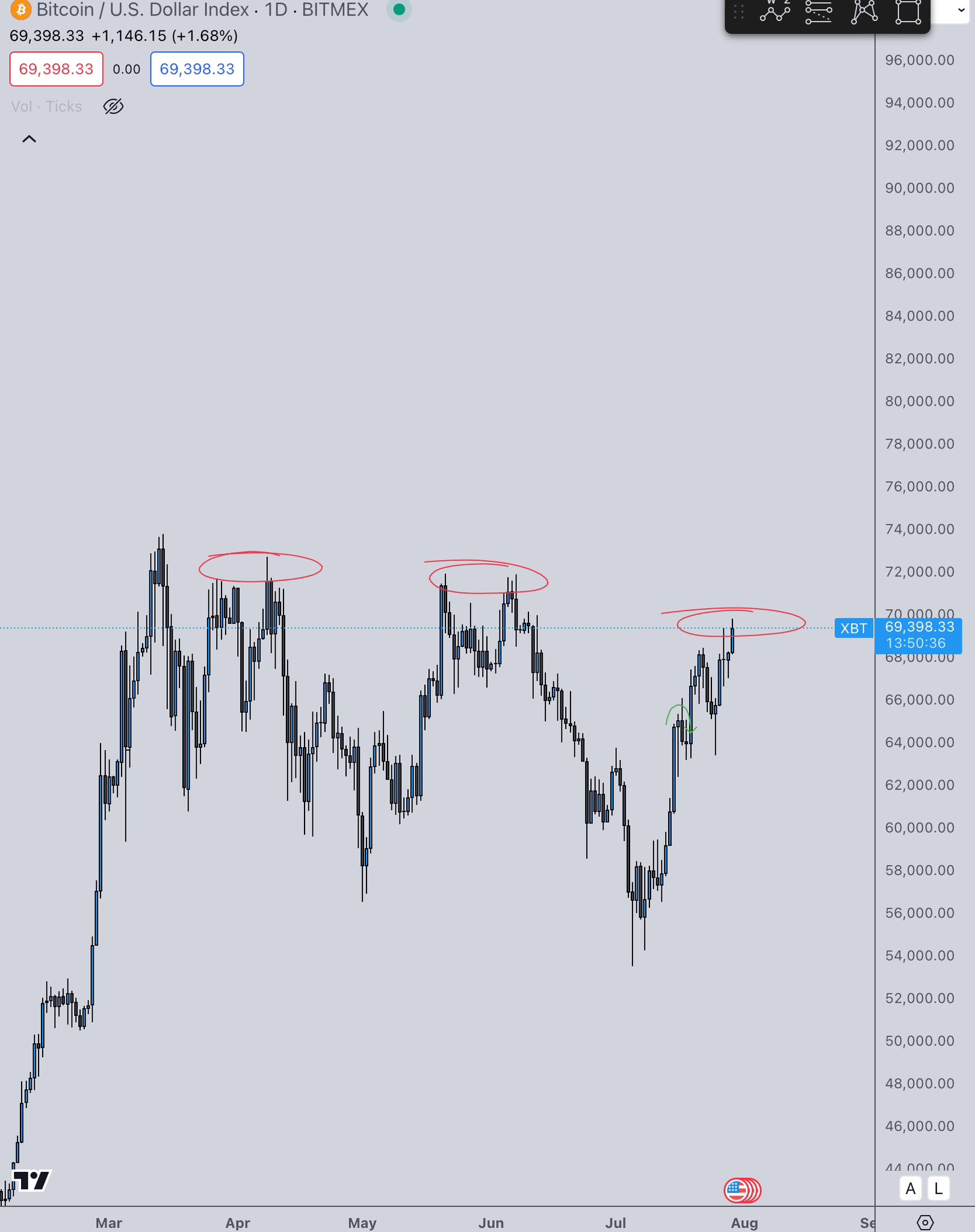 While we have fallen a little short of my USD short target for now, the BTC pairing has hit my upside target at this time and that along with my current low time frame bias on BTC is enough to trigger this setup for me.