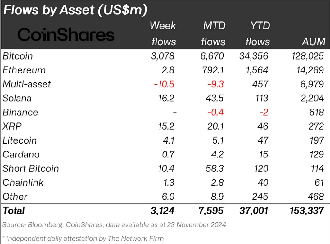 In total, the assets under management (AUM) of cryptocurrency investment products grew to $153.3 billion as a result of these inflows and the recent cryptocurrency market rally, which saw the price of Bitcoin near $100,000 before a correction saw it drop to $92,800 at the time of writing.