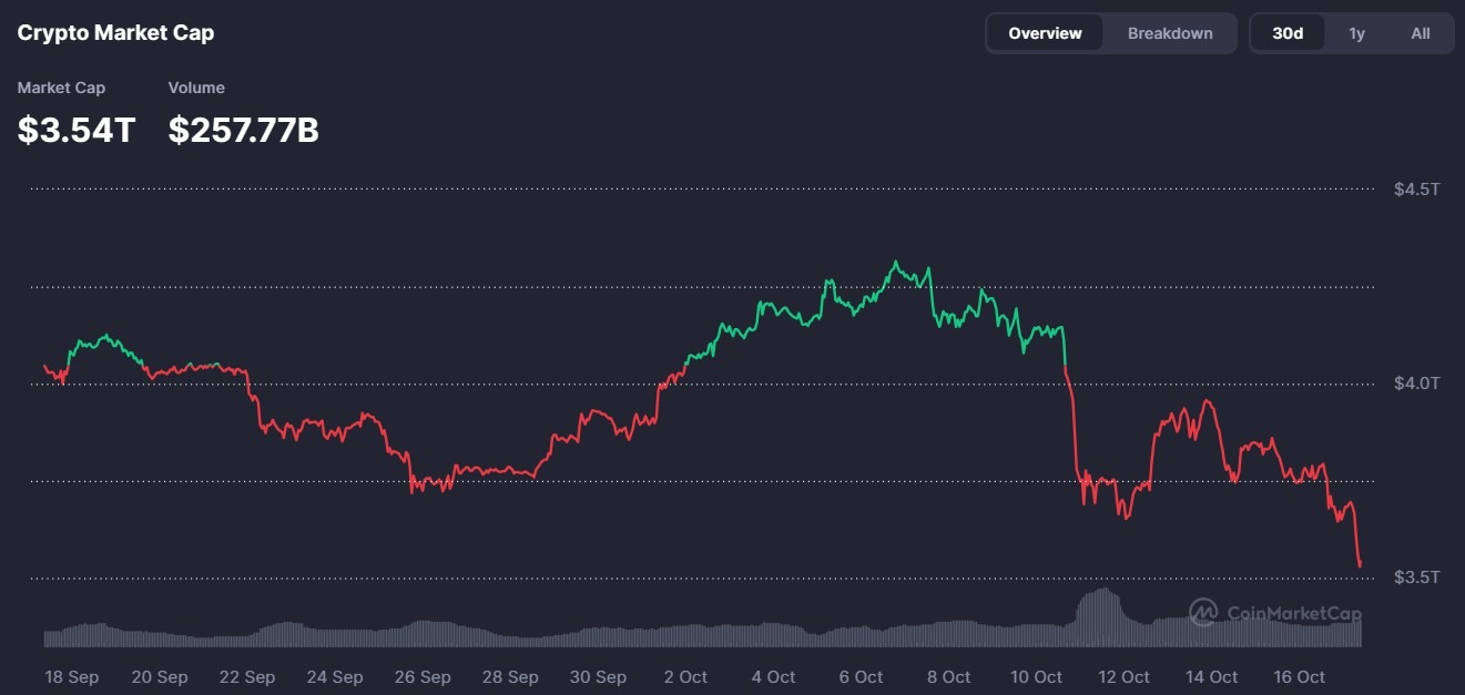 CoinMarketCap data showed that on Friday, the total crypto market capitalization dropped to about $3.54 trillion, a 6% drop from $3.78 trillion the previous day. This wiped out over $230 billion in value from the sector, marking one of the sharpest single-day declines in months.
