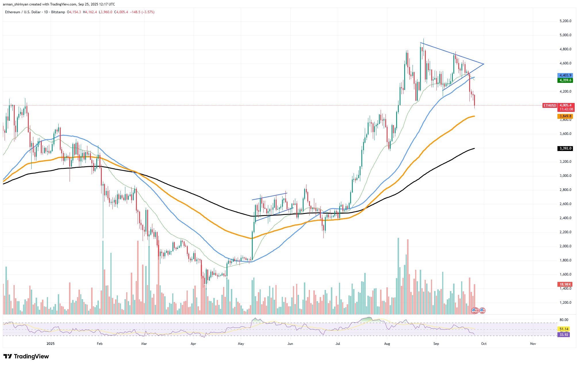The next significant area of interest, if selling persists, is around the 100-day EMA, which is close to $3,833. This moving average has historically served as a dependable level of support during periods of correction, so buyers may intervene there to protect against further losses. Ethereum might level off and try to push back toward $4,200 if the 100 EMA holds.