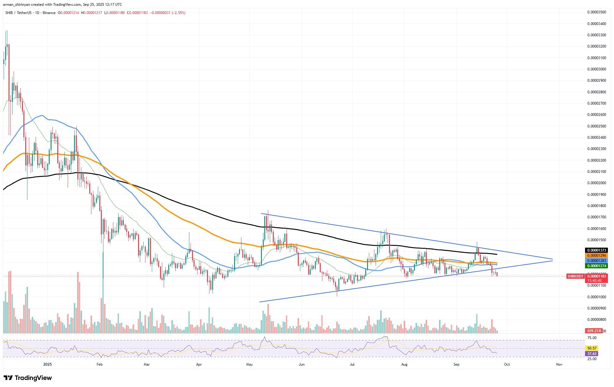 The price of Shiba Inu has fallen below important support levels, indicating that a retest of the $0.00001 bottom may be closer than many anticipated. This indicates that the stock is once again under strong selling pressure. According to the asset’s current structure, if sentiment and technicals do not rapidly improve, the asset may be headed for new 2025 lows. The symmetrical triangle structure that had previously kept the price of SHIB stable for months has now been broken on the daily chart.