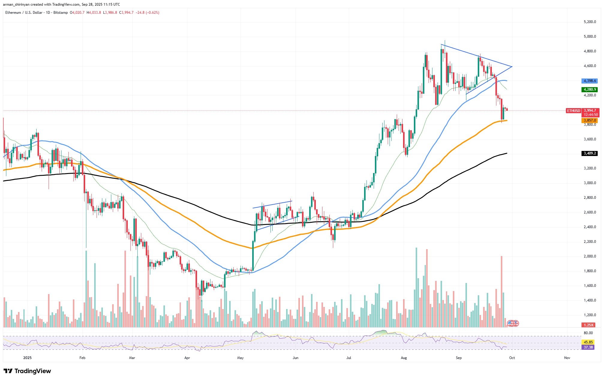 At 37, a surge of sell pressure caused the RSI to approach oversold territory, providing technical traders with a point of entry for a recovery. Volume data indicates that although buying interest has increased, it is still not robust enough to ensure long-term momentum. Since it serves as a mid-range pivot between the $3,800 support and the $4,300 resistance, as well as a psychological threshold, the $4,000 level is crucial.