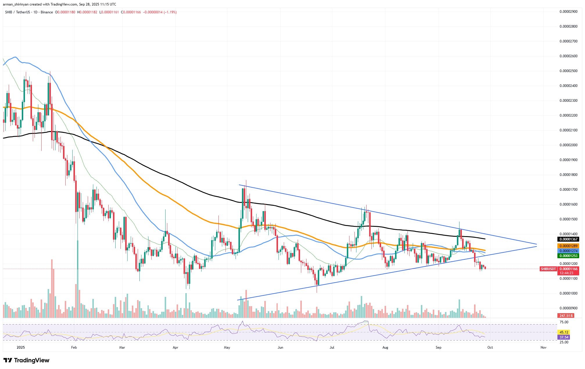 Trends in volume support this pessimistic view. Comparing trading activity to previous accumulation phases, it has collapsed, indicating a sharp decline in investor interest in SHIB. Since there are fewer bids to absorb sell orders, downside moves typically accelerate in low-volume settings. Another level of concern is added by momentum indicators. The RSI is slightly above oversold territory at 37, indicating weak momentum.