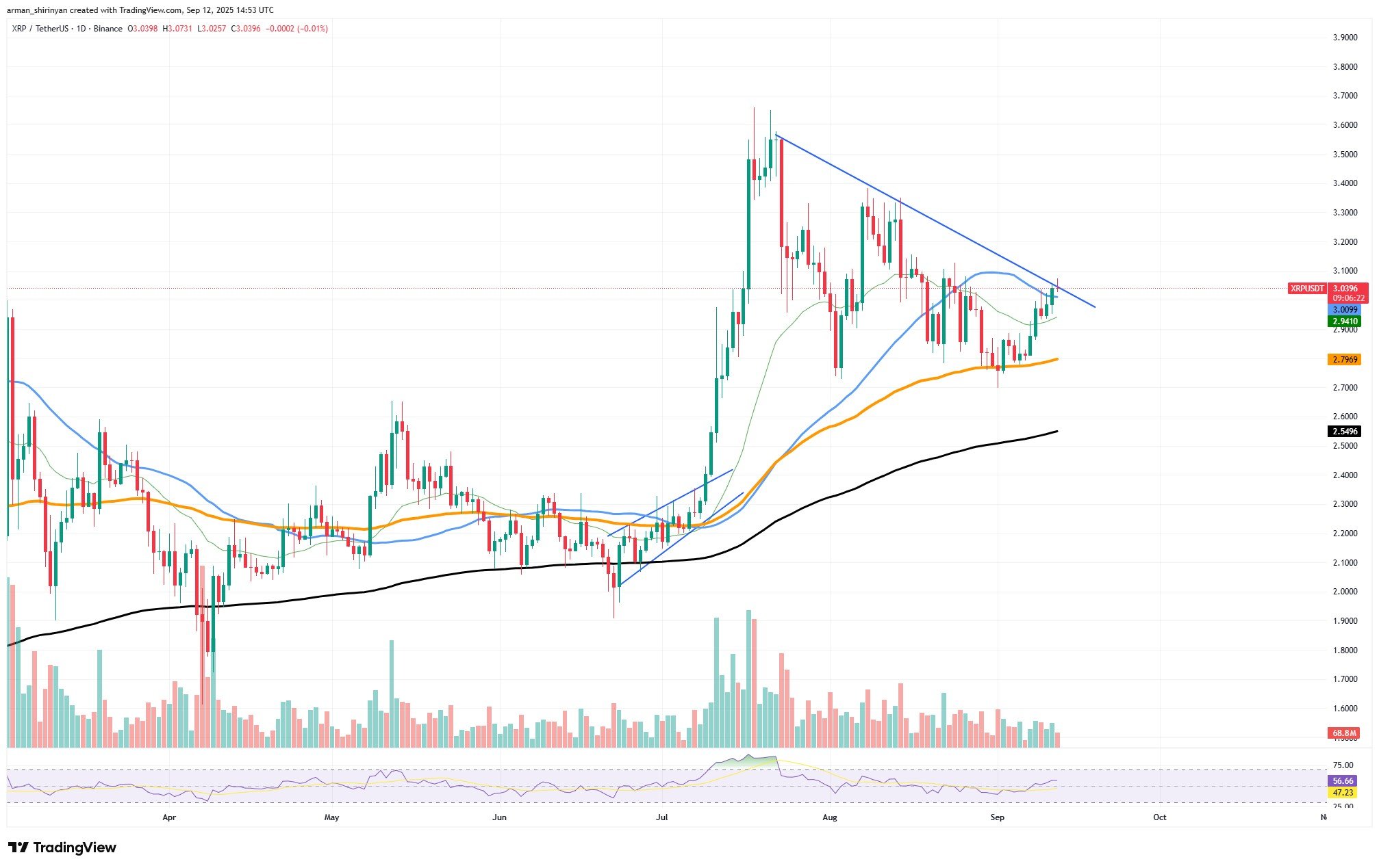 The result of XRP‘s latest test of a critical resistance level may determine the direction of its next significant move. XRP is currently battling a declining trendline that has repelled multiple rallies since late July, with the price hovering around $3.06. The aggressive target of $5 could once again be on the table, if a confirmed breakout here opens the door to a more extensive bullish expansion.