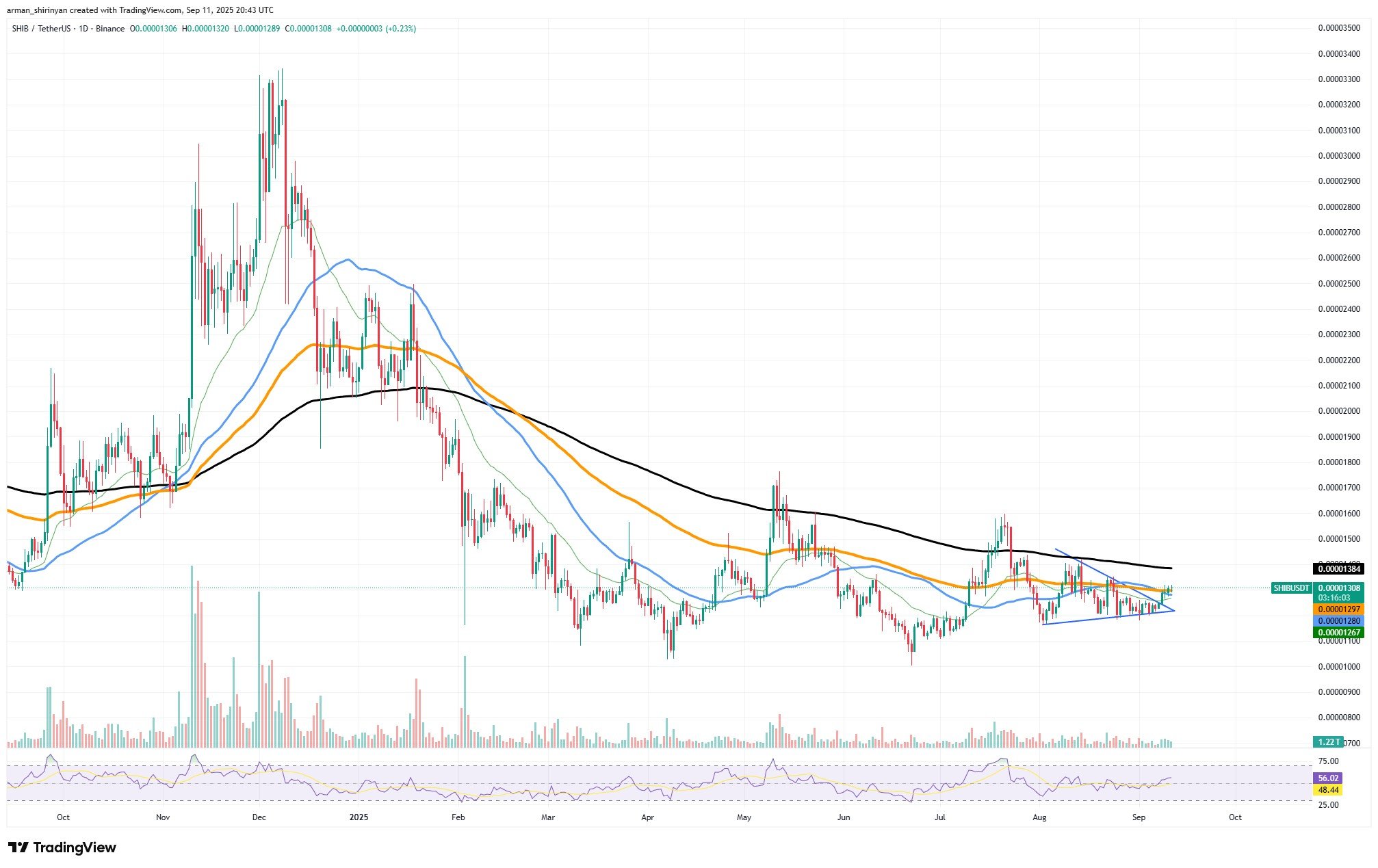 Shiba Inu is stabilizing around $0.000013, and it is starting to exhibit technical dominance. SHIB is now taking back key moving averages after months of sideways consolidation and unsuccessful breakout attempts, setting itself up for possible growth in the near future.