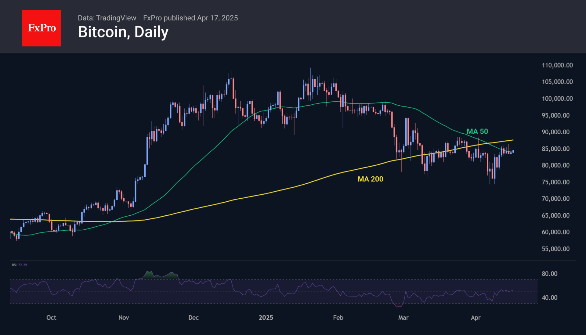 Bitcoin continues to trade within a relatively narrow range of $83K–$86K, hovering around the 50-day moving average but still struggling to break above the 200-day. On the daily chart, the RSI is showing a bullish divergence, with a higher low on the indicator despite a lower local price low.