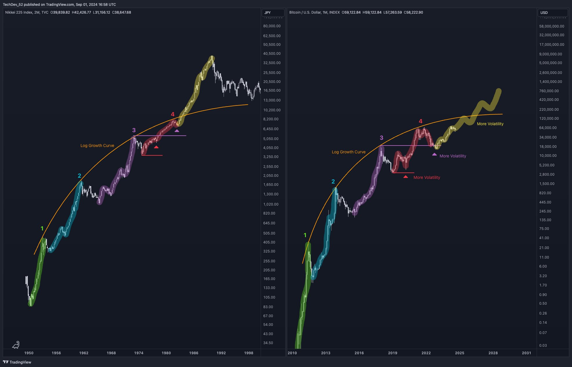 TechDev recently compared Bitcoin’s historical price action to the Nikkei 225, the biggest Japanese stock market index.