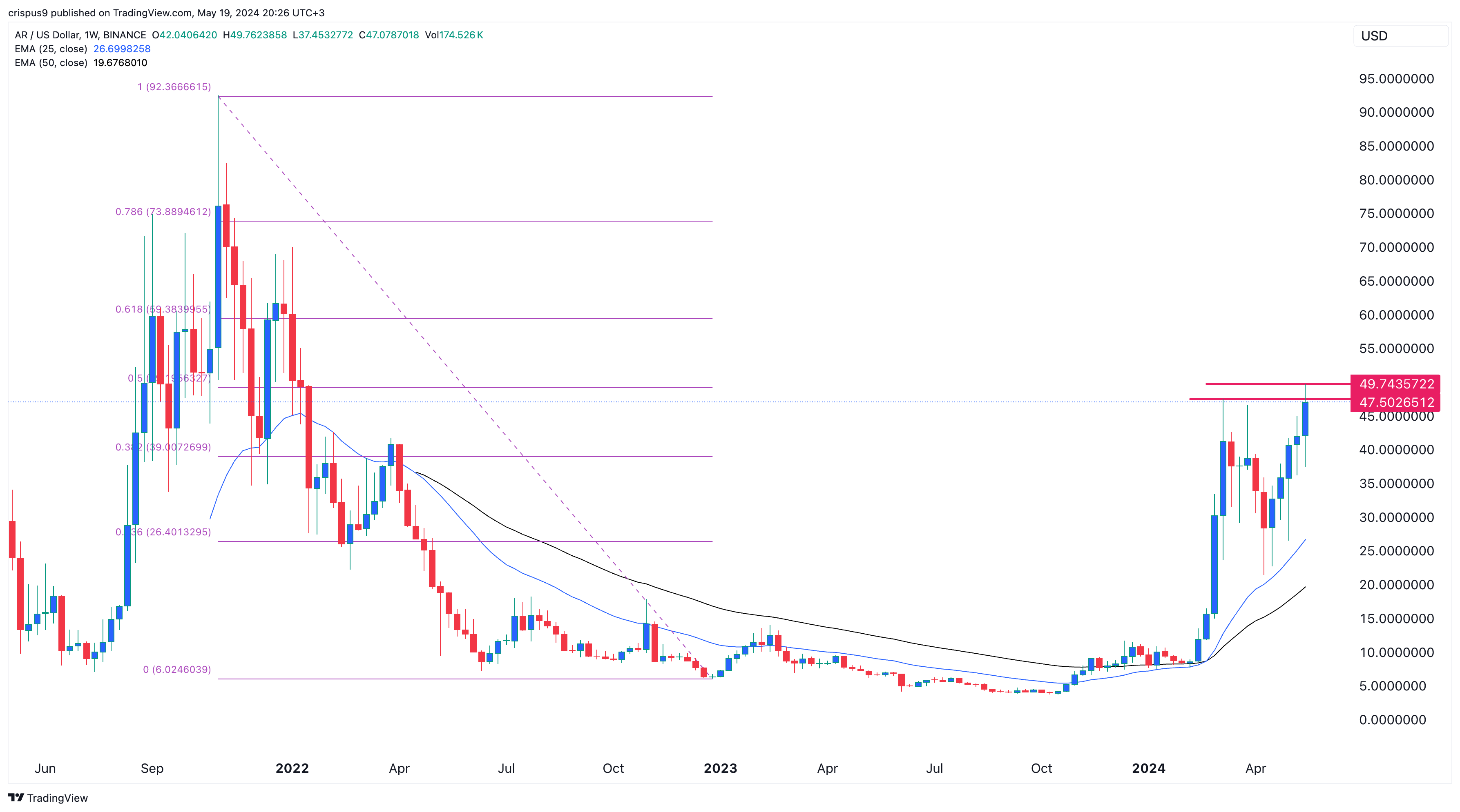 It is now hovering at $48, its previous highest point this year, meaning that it is forming a double-top pattern, a popular bearish sign. Arweave is also nearing the 50% Fibonacci Retracement level.