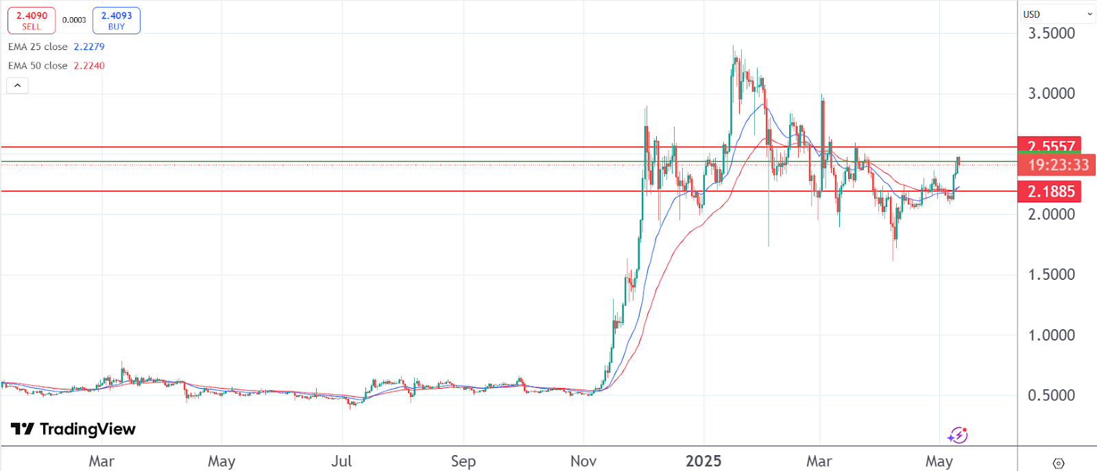 At the immediate term, Dogecoin price may consolidate its strong gains around the resistance zone of $0.2500 as the bulls gather additional momentum to rally to the next target at $0.2710. On the flip side, a pullback will likely place the support level at $0.2185.