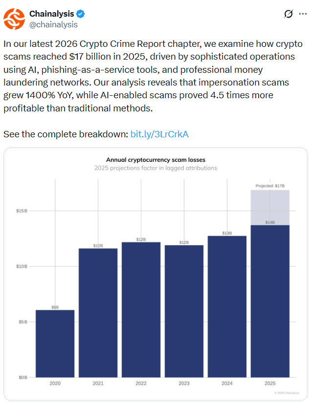 “As we move into 2026, we expect further convergence of scam methodologies as scammers adopt multiple tactics and technologies simultaneously,” Chainalysis added.
