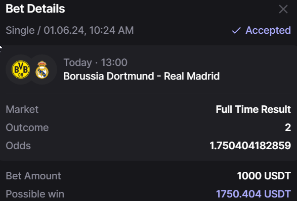 As always, we like to test things out. So yesterday on Bookmaker.xyz we placed a $1000 bet on Real Madrid to win the Champions League within the official playing time. Thank you Los Blancos!