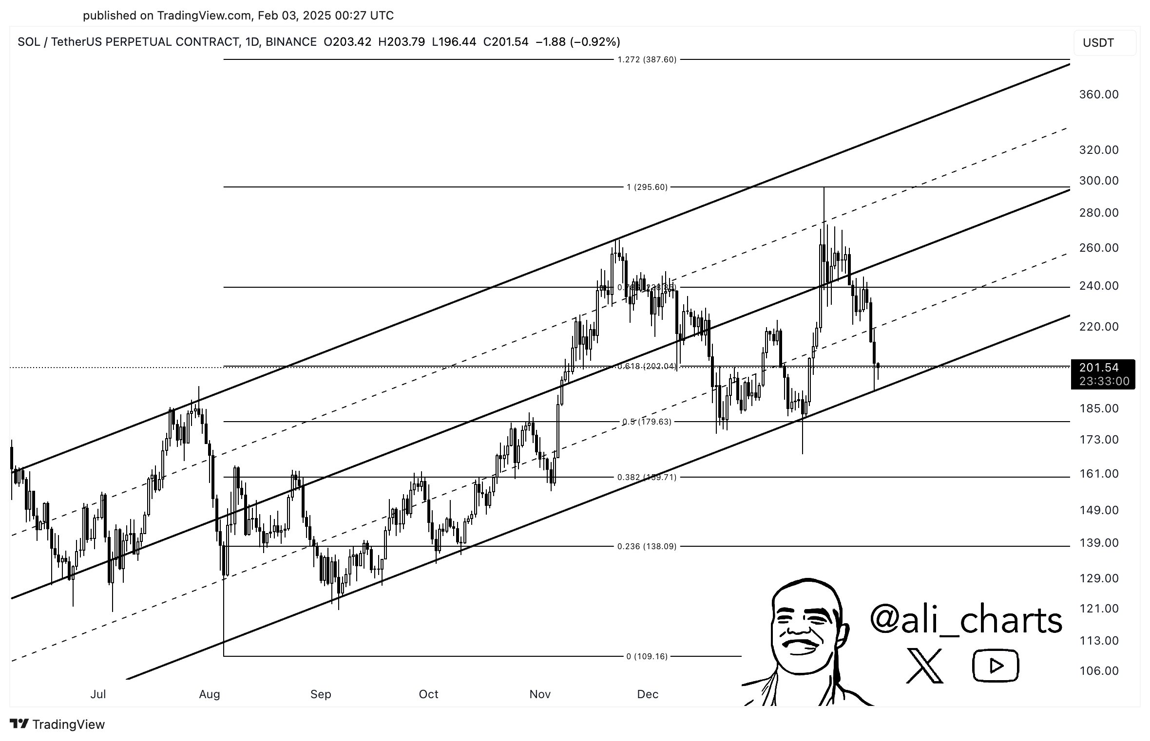Looking at the trader’s chart, he seems to suggest that SOL is still trading within an ascending parallel channel – a pattern indicating that an asset is an uptrend, printing higher highs and higher lows. But he notes that losing $191 as support means invalidating the channel’s diagonal support, potentially ending a multi-month uptrend.