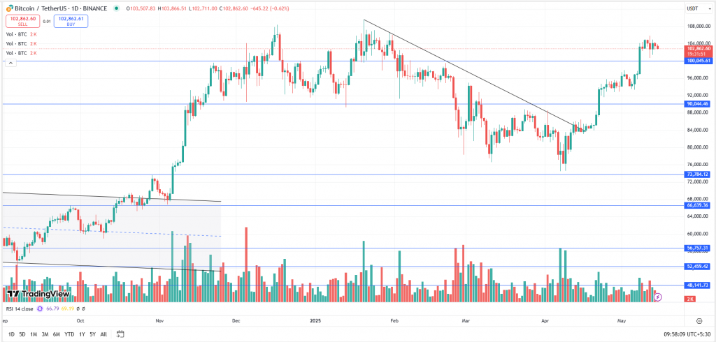 Retail traders often join the Bitcoin rally late, typically following strong momentum or fresh all-time highs — and 2025 seems no different. As Bitcoin approached $104,000 on May 14, retail participation remained subdued, even as institutional buying continued to dominate. Analysts suggest that retail investors have been the largest net sellers of BTC this year, while institutions have accumulated during dips. However, if past trends repeat, a wave of retail interest is likely to build roughly a week after BTC crosses the $109,350 threshold, potentially adding more fuel to the ongoing bull run.