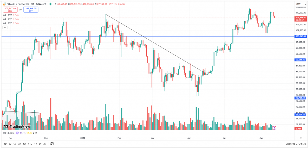 BTC, after making a new all-time high of $111,980, witnessed some profit booking at higher levels, and the price fell almost 10.35%, dropping to $100,382. The asset took support at the key psychological level of $100k and bounced back up to $110k. The bulls are struggling to maintain momentum at higher levels, and BTC is facing resistance around $110,000. To rally further, it needs to break, close, and sustain above $110k, whereas $100,000 and $90,000 will act as strong support levels for the asset.