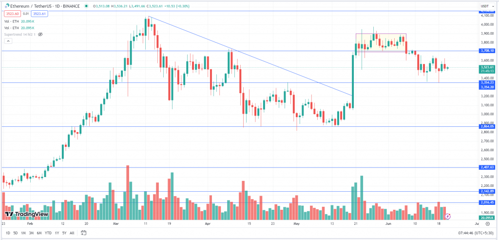 ETH after giving a breakout above the ‘Descending Triangle’ pattern, the prices rallied up to $3,977. However, the bulls failed to cross the psychological level of $4,000 and started to trade in a range between $3,900 to $3,700 with declining volumes. The asset has broken the range on the downside but with low volumes and made a low of $3,491. ETH has strong support at $3,350 and a lower longer shadow at these levels indicates buying whereas $3,700 will now act as a resistance for the asset.