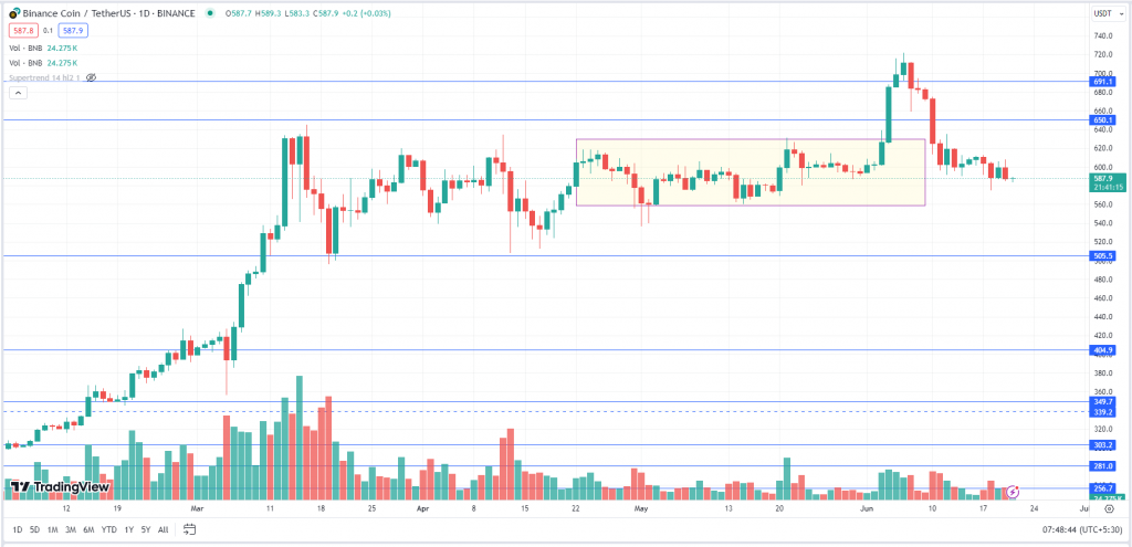 BNB was consolidating and was trading in a range from $560 to $620. The asset finally gave a breakout above the range and made a new all-time high of $721. Post this move, BNB witnessed some profit booking at higher levels and failed to give a weekly close above the previous all-time high of $691. The prices corrected almost by 20% and dropped to $575. BNB has a strong support at $560. If it holds the support then we may expect the bulls to resume the up move.