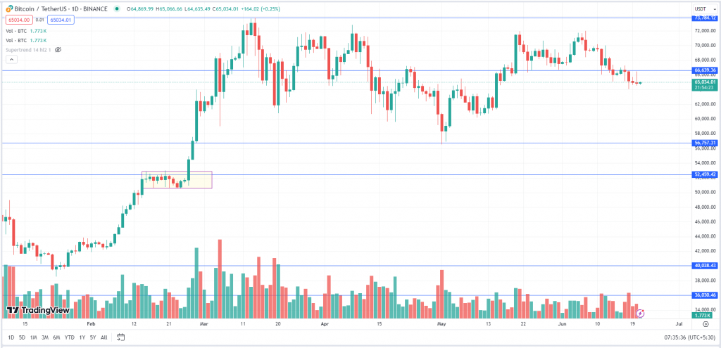 BITCOIN after correcting almost by 23% from its all-time high of $73,777 dropped to $56,552. The lower shadow around the crucial support level of $56,000 indicated buying from these levels and the prices rallied up to $71,979. However, the bulls did not succeed in breaking the all-time high and the asset struggled to sustain above the $70k mark and the prices corrected to $64,060. Currently, the asset has made small doji candles over the past three days which indicates indecision at these levels. BTC has a strong support zone from $62,000 to $60,000 whereas $66,500 will act as a strong resistance.