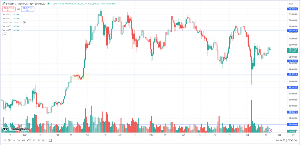 Bitcoin continued to struggle to sustain above the $70K mark as the prices corrected almost by 25% and made a low of $49,000. However, the asset didn’t give a daily closing below the key support of $52,500, and the lower longer shadow around $50K indicated buying and it ralling up to $62,745. Currently, BTC is trading sideways in a range from $57,500 to $62,000 with low volumes. Breakouts on either side of the range with good volumes will further decide the trend for the asset.
