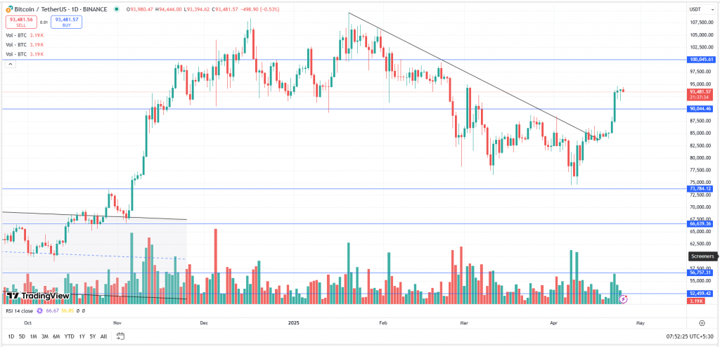 On April 22, U.S. Treasury Secretary Scott Bessent described the current 145% tariff structure with China as “unsustainable” in an interview with Bloomberg, hinting at a potential reduction in the near term. President Donald Trump reinforced this outlook later that day, stating that tariffs “will come down substantially,” further boosting market optimism. Trump also reassured investors by confirming that Federal Reserve Chair Jerome Powell would remain in his position, alleviating concerns about leadership disruptions at the central bank. These remarks fueled a wave of risk-on sentiment across global markets, with investors turning to digital assets amid growing confidence in trade stability and macroeconomic clarity.