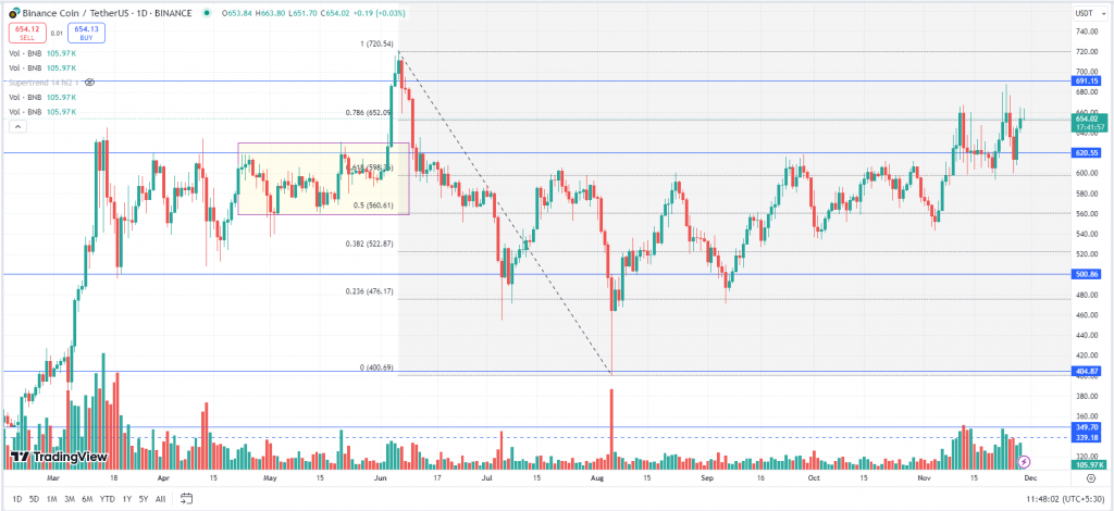 BNB is consolidating and is trading in a broad range from $600 to $665 with declining volumes. Once it gives a breakout above $700 then we may expect the prices to break the all time high of $721 and rally further. $600 will act as a strong support for the asset.
