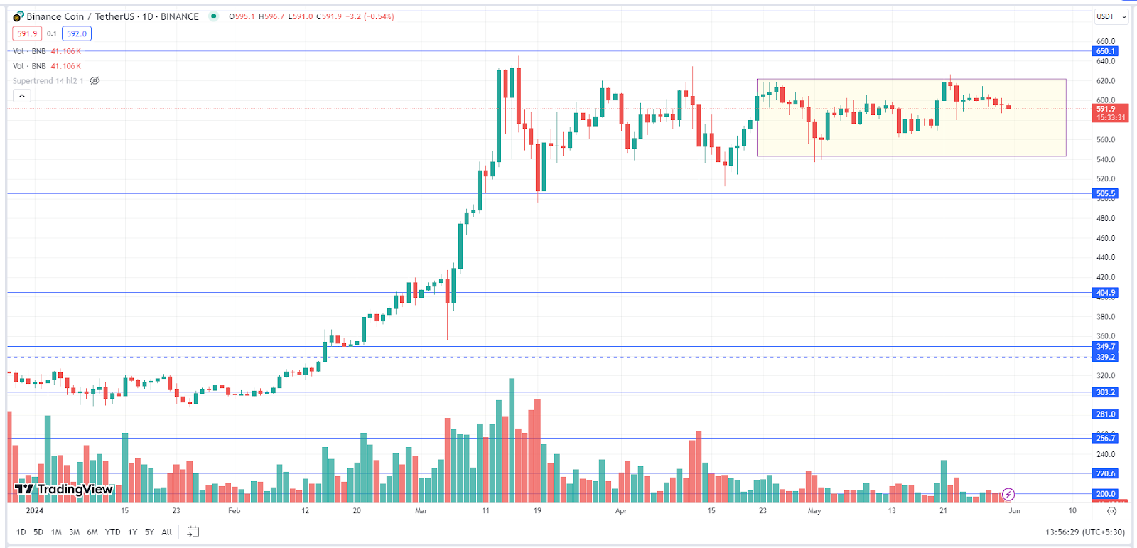 BNB after giving a breakout above $400 started moving up by making a ‘Higher High Higher Low’ pattern and surged up to $645. Post this move, the asset witnessed a sharp correction from the recent top and dropped to $495.8. BNB took good support at $500 and bounced back up to $634. However, the bulls failed to break the recent top of $645 and saw some selling pressure at higher levels. Currently, the asset is consolidating and trading in a range from $555 to $625 with declining volumes. Breakouts on either side of the range with good volumes will further decide the trend for the asset.
