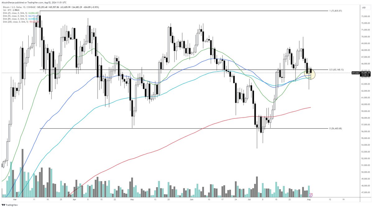 “BTC: lots of conflicting signals here. On the one hand, this level has a lot of one-day exponential moving averages (EMAs). Usually, they act as support here.