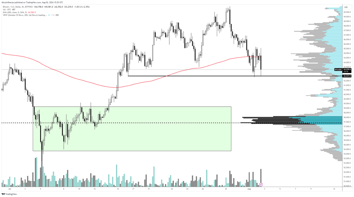 “If we lose this region [around $62,000], it’s $58,000 in my opinion. That’d be a violent move overall. I still think this area is ok. And if you zoom out on the one day, we’re still in the large trading range of $55,000-$73,000.”