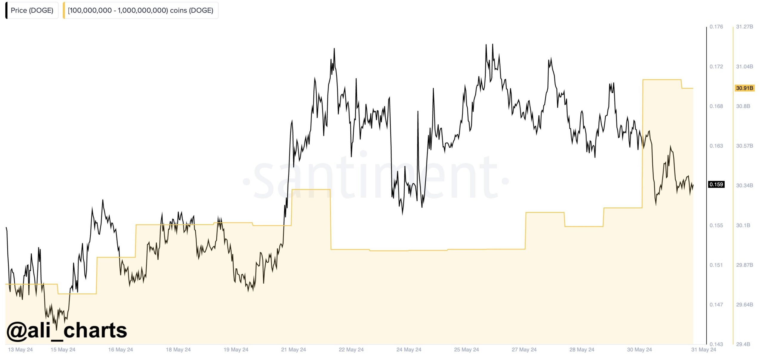 Crypto strategist Ali Martinez tells his 63,100 followers on the social media platform X that deep-pocketed investors have snapped up 700 million DOGE worth $112 million in just 72 hours.