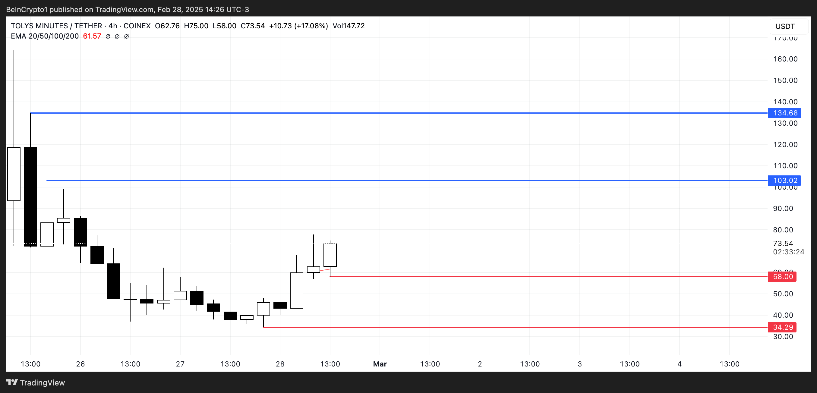 If the hype continues, TOLY could test a resistance at $103, and breaking that level could trigger a rally toward $134. Conversely, if momentum fades, TOLY could drop to $58, and if that support is lost, it could decline further to $34.