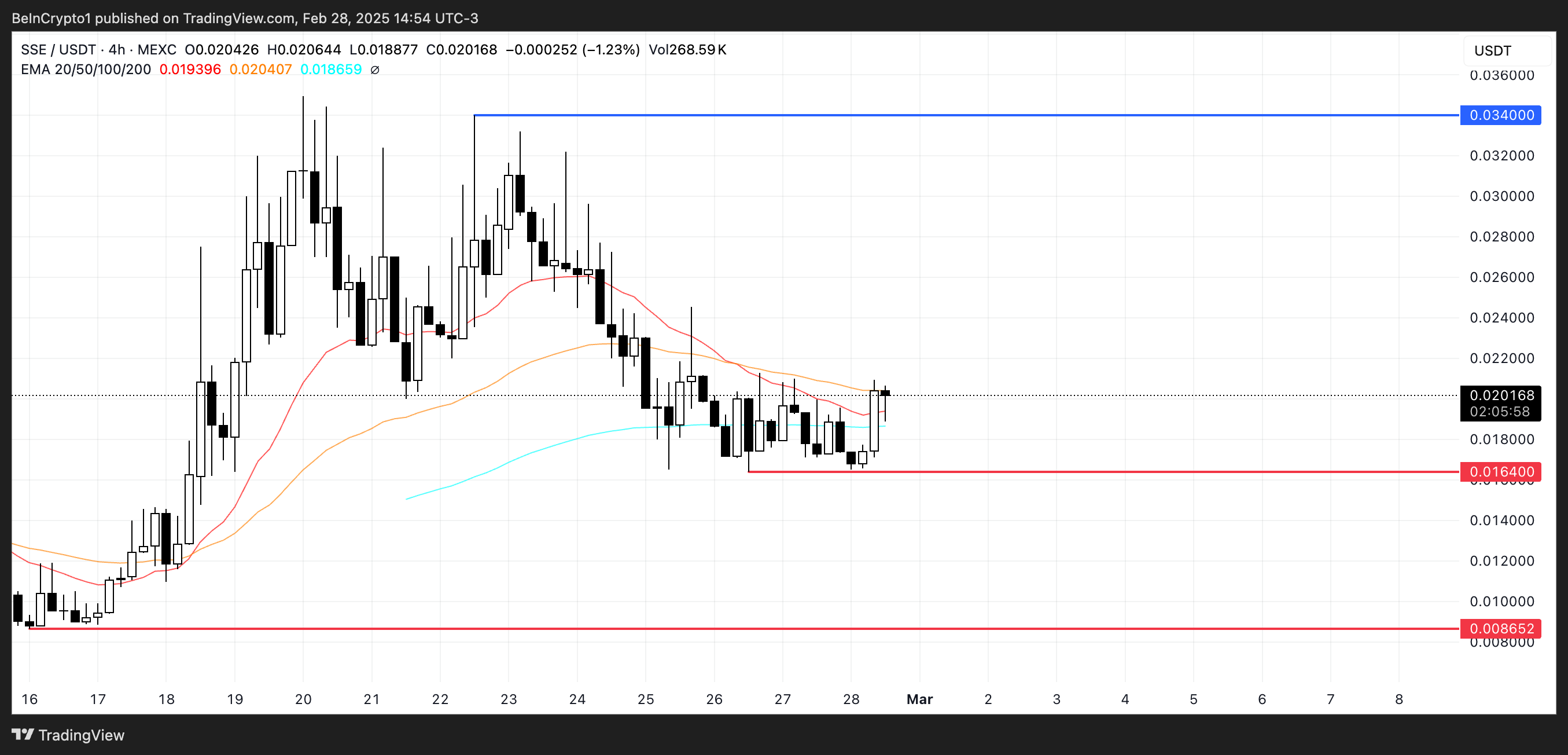 Conversely, if the price faces a downturn, SSE could test the support at $0.016. If that level is lost, it could decline further to $0.0086.