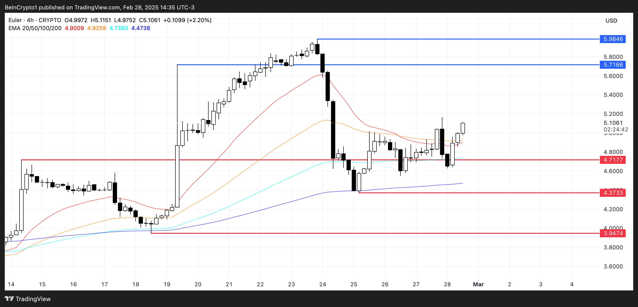 Conversely, if another correction occurs, EUL could test support at $4.71 or $4.37, and if these levels fail, it could decline further to $3.94. These support and resistance levels will be key in determining EUL’s next directional move.
