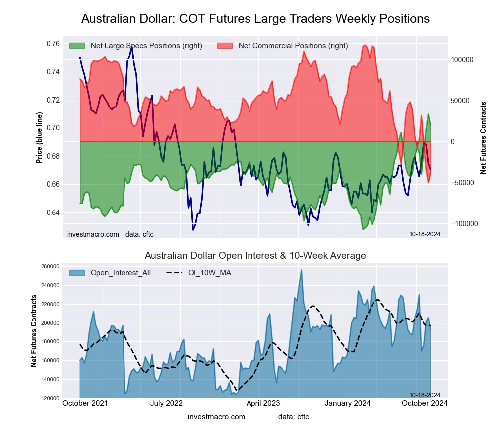 The Australian Dollar large speculator standing this week recorded a net position of 19,269 contracts in the data reported through Tuesday. This was a weekly decrease of -14,153 contracts from the previous week which had a total of 33,422 net contracts.
