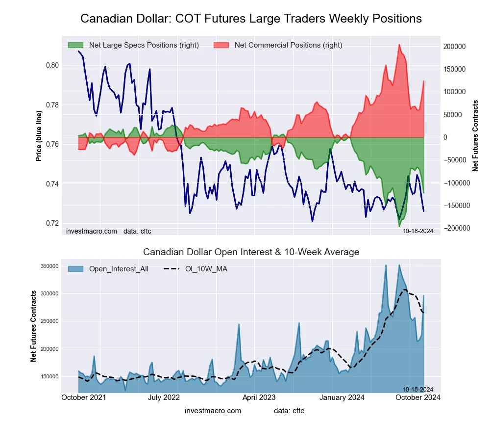 The Canadian dollar saw the largest decrease in speculator bets for all the currencies this week. The weaker sentiment coincides with declining oil prices as well as with the expectation the Bank of Canada will be potentially reducing their interest rate by 50 basis points in the coming week. This week’s speculator standing for the CAD is the 10th most bearish level on record at a total of -122,393 net contracts. The all-time record low of -196,263 contracts took place not to long ago on July 30th of 2024.