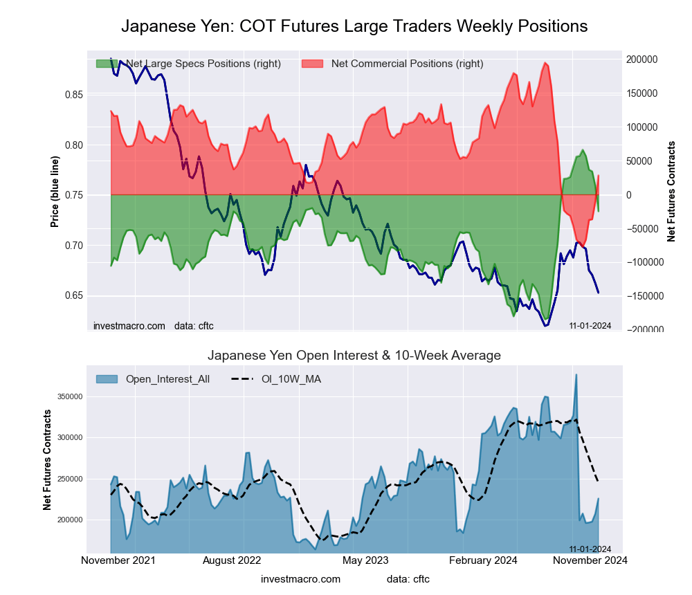 The Japanese Yen large speculator standing this week recorded a net position of -24,817 contracts in the data reported through Tuesday. This was a weekly lowering of -37,588 contracts from the previous week which had a total of 12,771 net contracts.