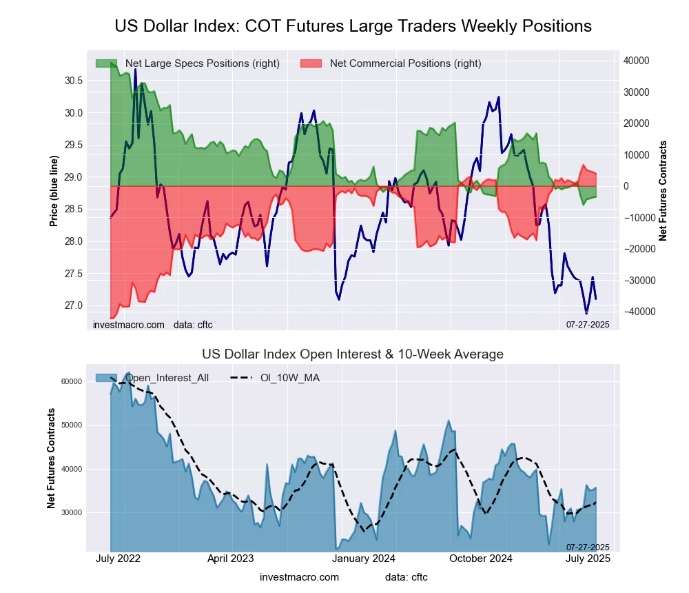 The US Dollar Index large speculator standing this week equaled a net position of -3,451 contracts in the data reported through Tuesday. This was a weekly gain of 214 contracts from the previous week which had a total of -3,665 net contracts.