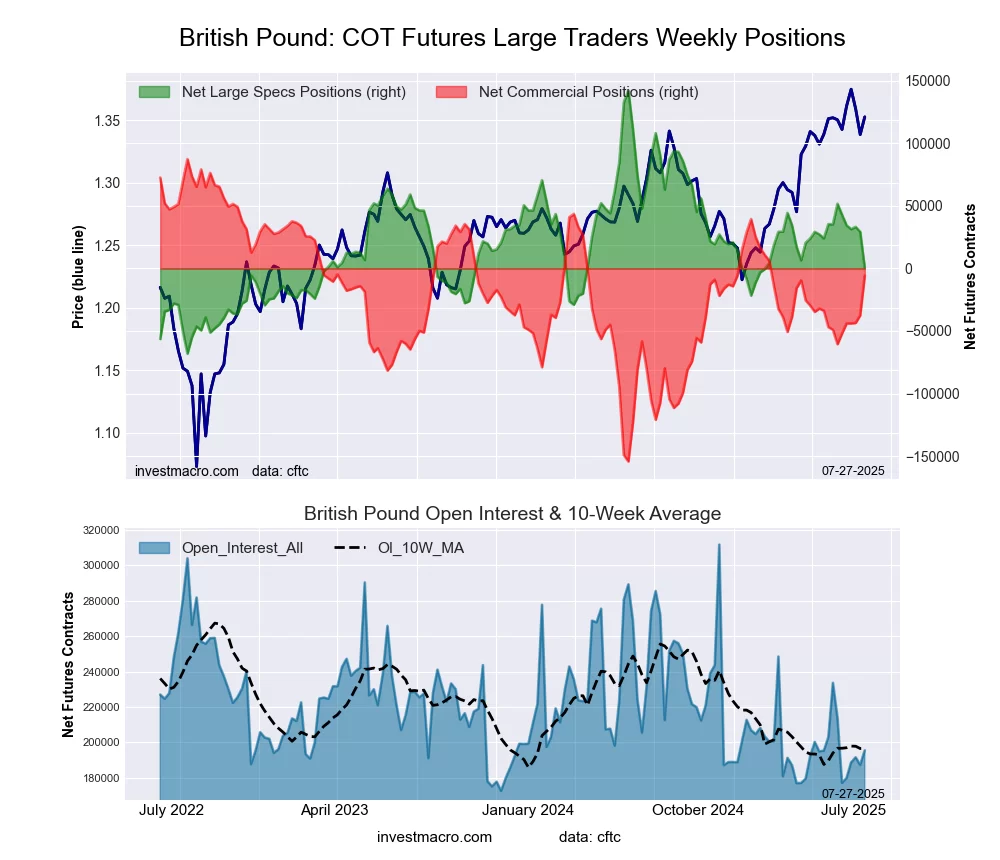 The British Pound Sterling large speculator standing this week equaled a net position of 570 contracts in the data reported through Tuesday. This was a weekly lowering of -28,621 contracts from the previous week which had a total of 29,191 net contracts.