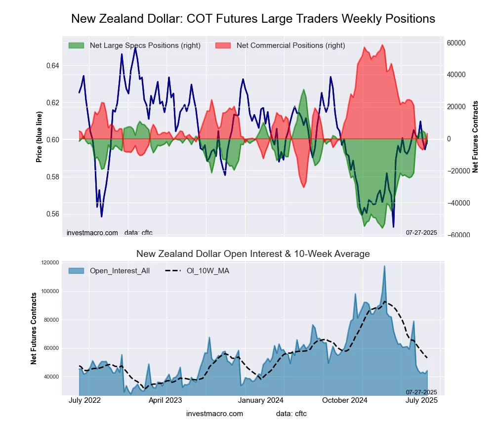 The New Zealand Dollar large speculator standing this week equaled a net position of -3,162 contracts in the data reported through Tuesday. This was a weekly lowering of -6,797 contracts from the previous week which had a total of 3,635 net contracts.