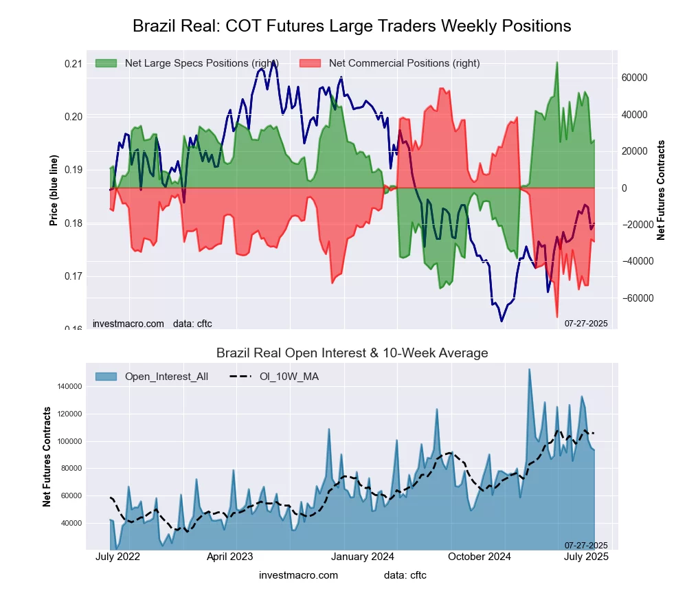 The Brazilian Real large speculator standing this week equaled a net position of 25,857 contracts in the data reported through Tuesday. This was a weekly rise of 1,685 contracts from the previous week which had a total of 24,172 net contracts.