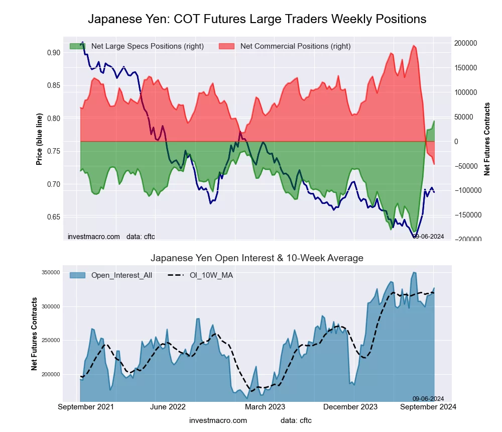 The Japanese Yen large speculator standing this week came in at a net position of 41,116 contracts in the data reported through Tuesday. This was a weekly gain of 15,248 contracts from the previous week which had a total of 25,868 net contracts.