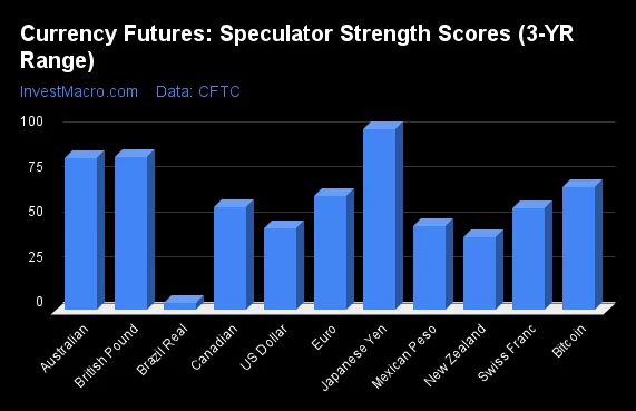 COT Strength Scores (a normalized measure of Speculator positions over a 3-Year range, from 0 to 100 where above 80 is Extreme-Bullish and below 20 is Extreme-Bearish) showed that the Japanese Yen (100 percent) and the British Pound (85 percent) lead the currency markets this week. The Australian Dollar (84 percent), Bitcoin (68 percent) and the EuroFX (63 percent) come in as the next highest in the weekly strength scores.