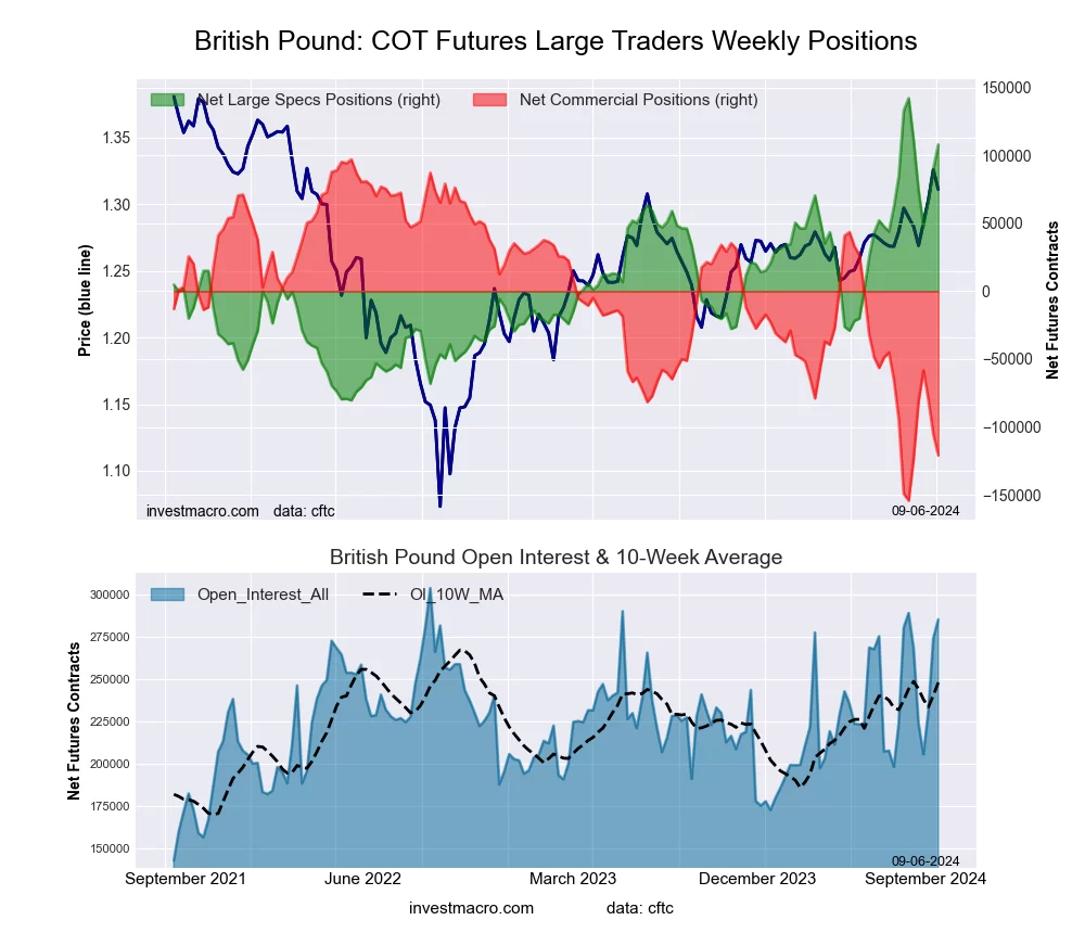 The British Pound Sterling large speculator standing this week came in at a net position of 108,078 contracts in the data reported through Tuesday. This was a weekly rise of 18,147 contracts from the previous week which had a total of 89,931 net contracts.