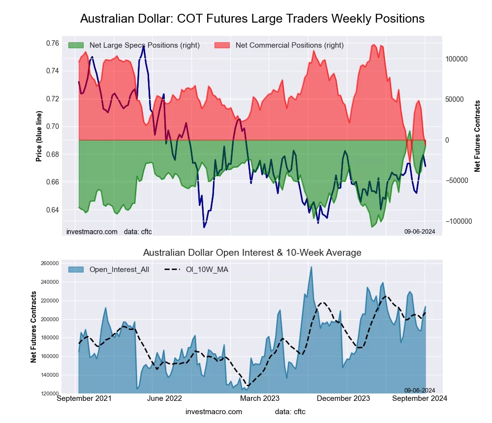 The Australian Dollar large speculator standing this week came in at a net position of -7,864 contracts in the data reported through Tuesday. This was a weekly boost of 11,295 contracts from the previous week which had a total of -19,159 net contracts.