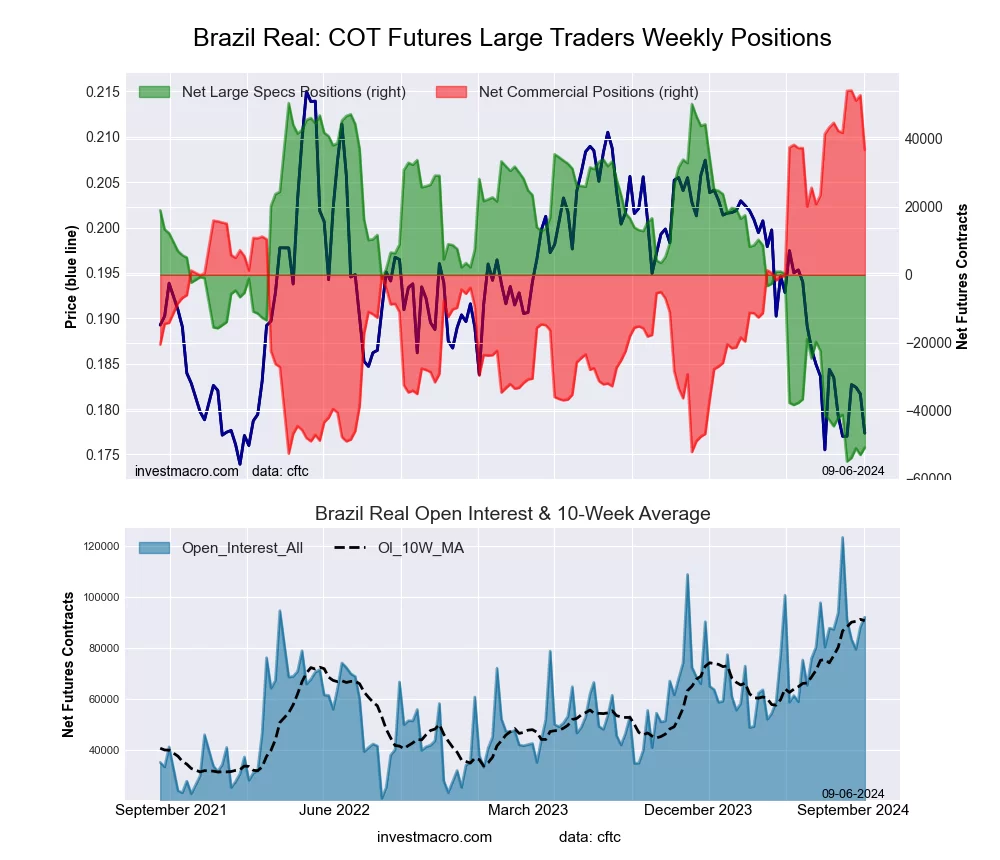 The Brazilian Real large speculator standing this week came in at a net position of -50,811 contracts in the data reported through Tuesday. This was a weekly gain of 2,152 contracts from the previous week which had a total of -52,963 net contracts.