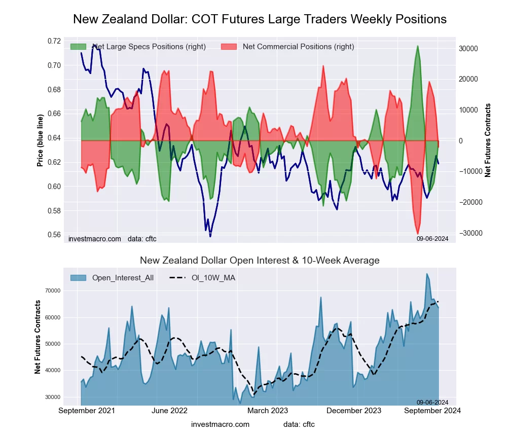 The New Zealand Dollar large speculator standing this week came in at a net position of -238 contracts in the data reported through Tuesday. This was a weekly gain of 8,078 contracts from the previous week which had a total of -8,316 net contracts.