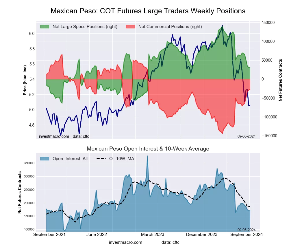 The Mexican Peso large speculator standing this week came in at a net position of 30,479 contracts in the data reported through Tuesday. This was a weekly decrease of -241 contracts from the previous week which had a total of 30,720 net contracts.
