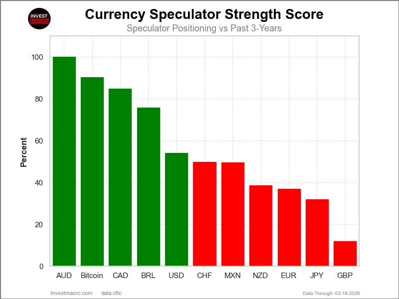 COT Strength Scores (a normalized measure of Speculator positions over a 3-Year range, from 0 to 100 where above 80 is Extreme-Bullish and below 20 is Extreme-Bearish) showed that the Australian Dollar (100 percent) and the Bitcoin (90 percent) lead the currency markets this week. The Canadian Dollar (85 percent), Brazilian Real (76 percent) and the US Dollar Index (54 percent) come in as the next highest in the weekly strength scores.