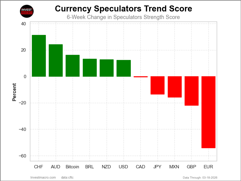 COT Strength Score Trends (or move index, calculates the 6-week changes in strength scores) showed that the Swiss Franc (31 percent) and the Australian Dollar (24 percent) lead the past six weeks trends for the currencies. Bitcoin (16 percent), the New Zealand Dollar (13 percent) and the Brazilian Real (13 percent) are the next highest positive movers in the 3-Year trends data.