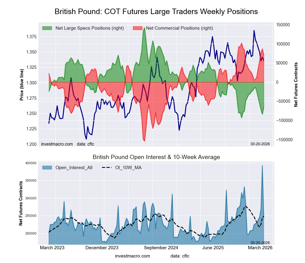 The British Pound Sterling large speculator standing this week resulted in a net position of -65,515 contracts in the data reported through Tuesday. This was a weekly rise of 18,682 contracts from the previous week which had a total of -84,197 net contracts.